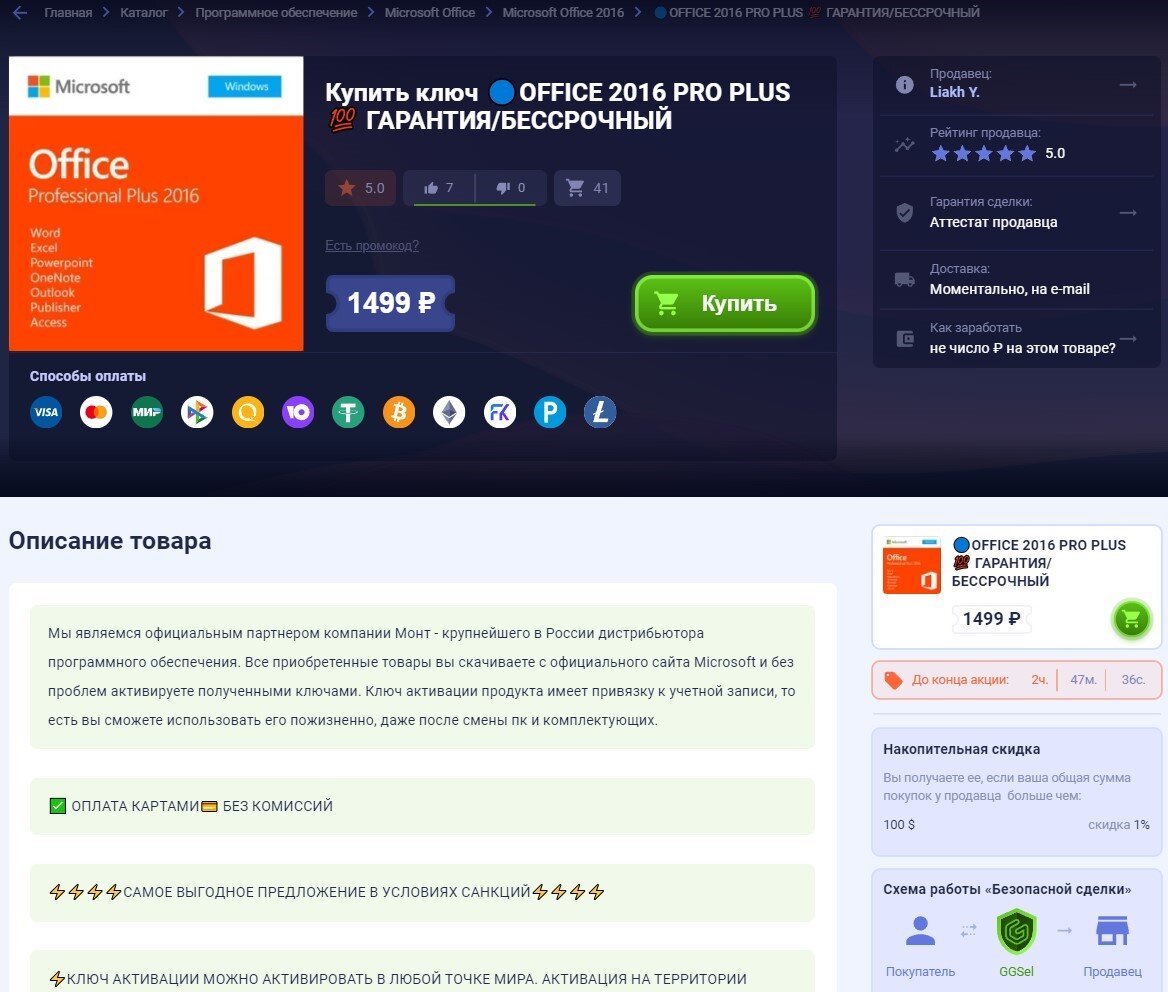 Поиск ключа не составит труда. При дисковом варианте ключ находится внутри упаковки. Если Office был взят на просторах интернета, то рекомендуется приобрести ключ активации через торговые площадки по типу ggsel.net. Для такого вида приобретения следует пройти данные пункты: