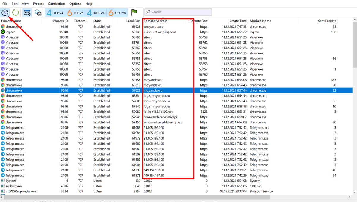 Жмём на «Remote address» для того, чтобы отсортировать список по удалённым соединениям. Если в данной строке * (звездочка), — (прочерк), 0.0.0.0 или 127.0.0.1 — то это внутренние соединения. Они нас не интересуют. Нас интересуют только те процессы, у которых в данном столбике есть цифры IP адреса.