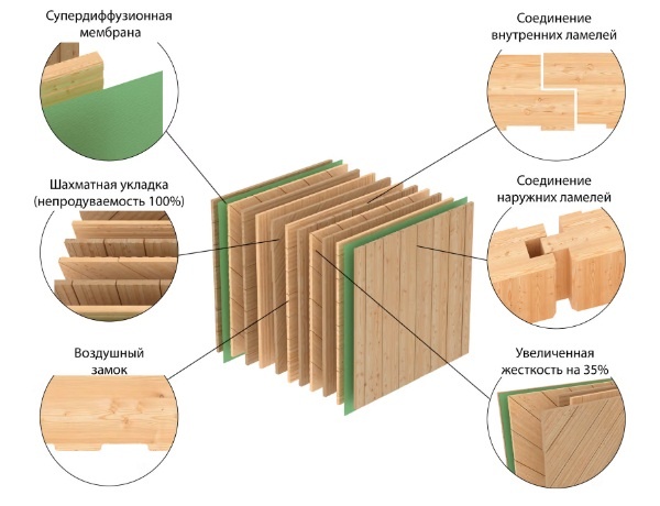 Технология производства деревянных панелей для стен дома пришла из Германии. Изготавливается из досок хвойных пород камерной сушки, которые укладываются крест-накрест и соединяются друг с другом алюминиевыми гвоздями (штифтами).