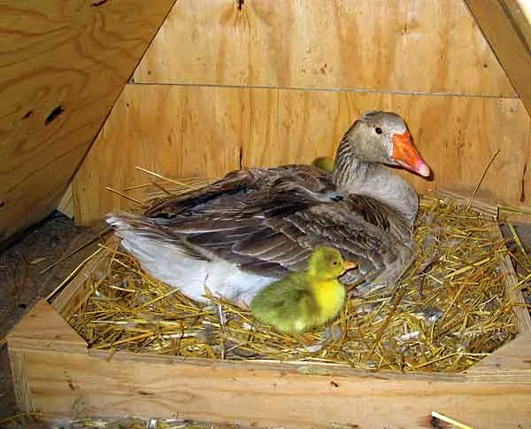 Для несущихся Гусей необходимо оборудовать гнезда. Для этого обычно используют ящики, с размерами 60х60х50 см, внутрь которых укладывают сено или солому. Их располагают по периметру помещения вдоль стен, как можно дальше от поилки и кормушки.