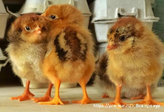 В суточном возрасте цыплята сортируются по полу по окраске пуха с точностью до 96 %. Петушки отличаются от курочек более светлыми крылышками.