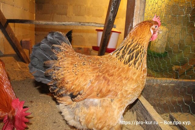 В хвосте у кур чёрное рулевое перо, но два верхних имеют одну рыжую сторону. Кроющее перо хвоста рыжее с чёрными краями. Крыло, бедро, грудь покрыты жёлто-рыжими перьями.