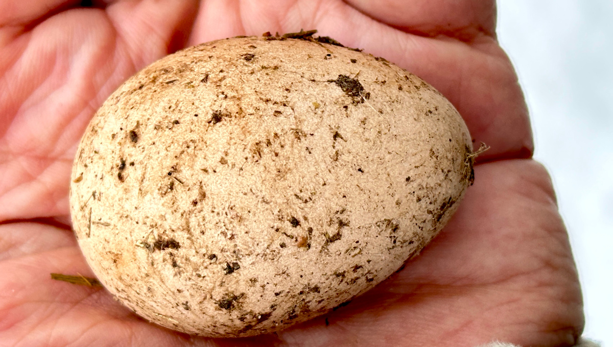 Да вот же! Прямо вчера: первое яичко, снесенное цесаркой! Куры из-за внезапных морозов начавшуюся было яйценоскость почти прекратили, а цесарки начали: у них график, биологические часы, фенологическая ответственность.