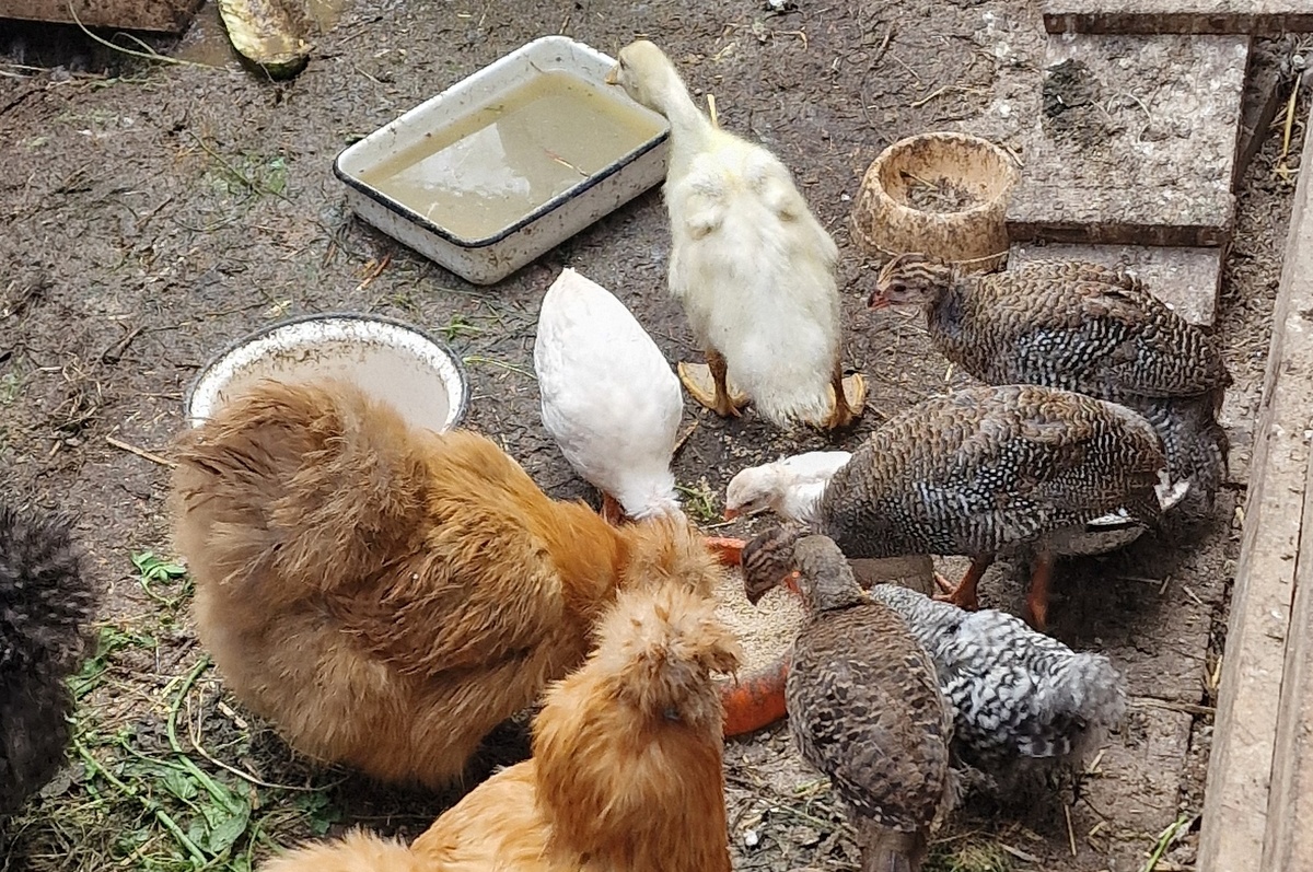Подрастающие птенцы цесарок среди других птиц. Птенцы эти тут еще и разного возраста, белый справа — самый младший, но вполне самостоятельный.